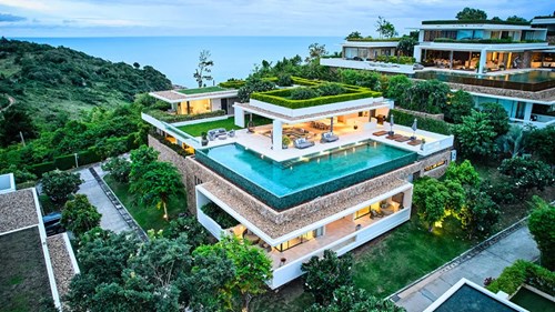 The villa’s striking cubist design, sleek interiors and sliding glass walls create a seamless connection with its surroundings. A unique L-shaped infinity pool wraps around a corner of the property, while interior gardens bring a touch of nature indoors. Villa Jacinta blends contemporary and sophistication with traditional Thai aesthetics.