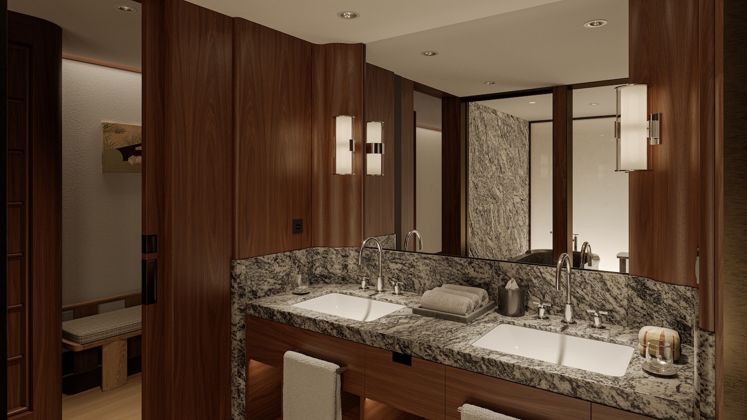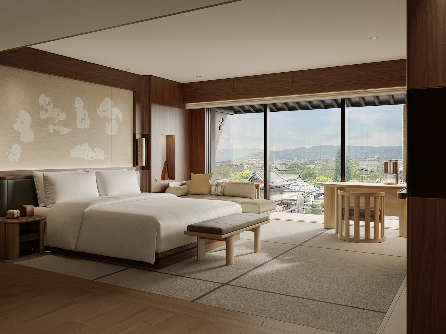 The hotel’s 89 rooms and suites are designed as tranquil retreats rooted in local sensibilities. Six signature suites each feature private onsen, inviting guests to experience a quintessentially Japanese ritual of relaxation within the privacy of their own accommodation. Soft light, serene palettes and bespoke detailing give each space a quiet confidence, a feeling of retreat in the midst of one of Japan’s most culturally resonant neighbourhoods.