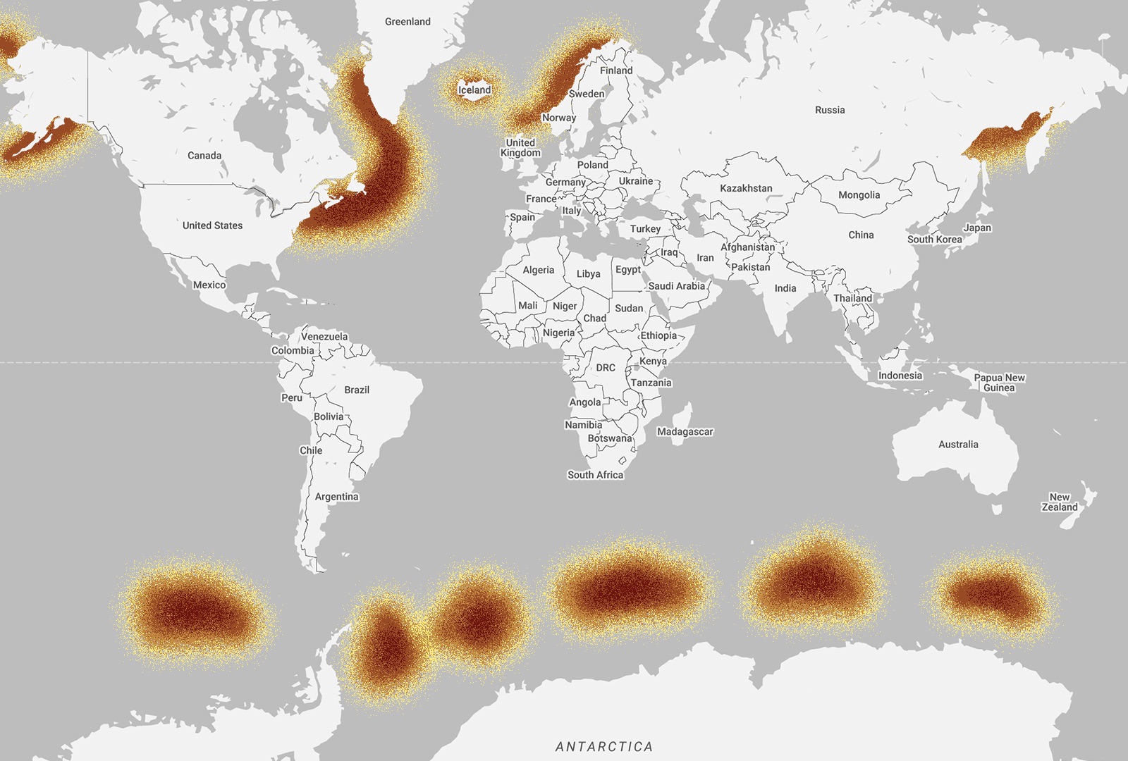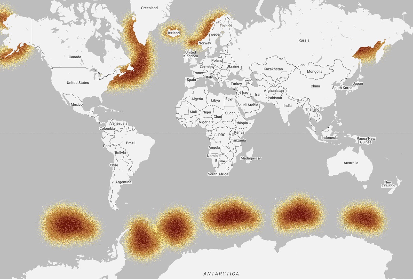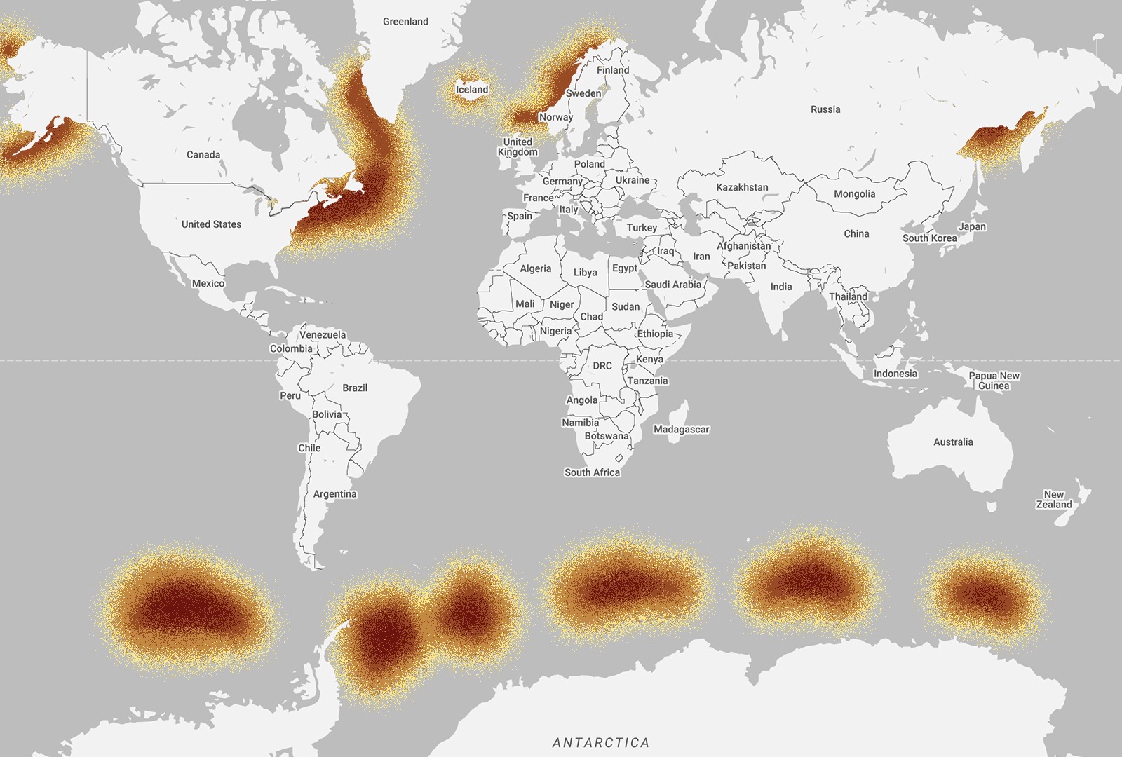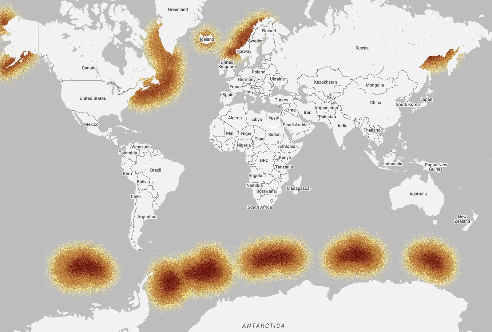 Humpback whales can be found all over the world, which means their migration pattern is wide and diverse. During the summer months, whales from the southern hemisphere spend their time in the south, feeding in the waters around Antarctica. Then during late Autumn, they begin their annual migratory route to their winter breeding and calving grounds in the warmer tropical waters of the Pacific. Whales from the northern hemisphere spend spring through to the fall feeding along the coastal and continental shelf waters that stretch from northern Japan, into the Bering Sea and towards California. During the winter, they head to their breeding grounds in one of the four main regions in the North Pacific: Hawaii, Mexico, Central America and Asia – specifically the islands south of Japan, Taiwan and the Philippines.